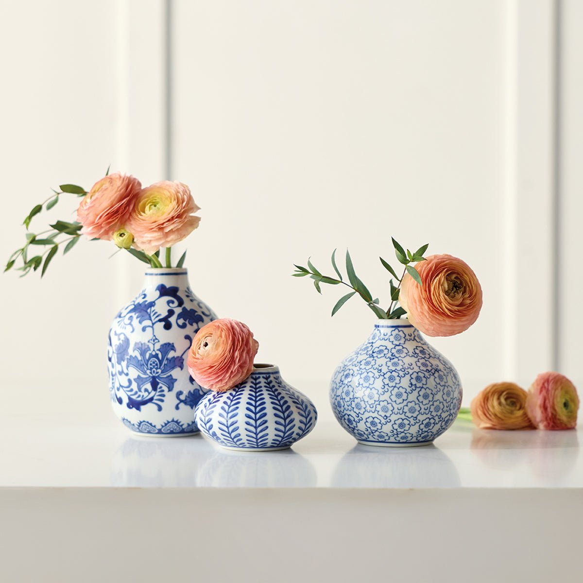 Each blue and white vase in this stoneware set features a unique shape and pattern, adding character and charm to any space. Perfect for displaying fresh blooms or standing alone as decorative accents. Set of three. Sizes range from 2 1/2"h–5 3/4"h.