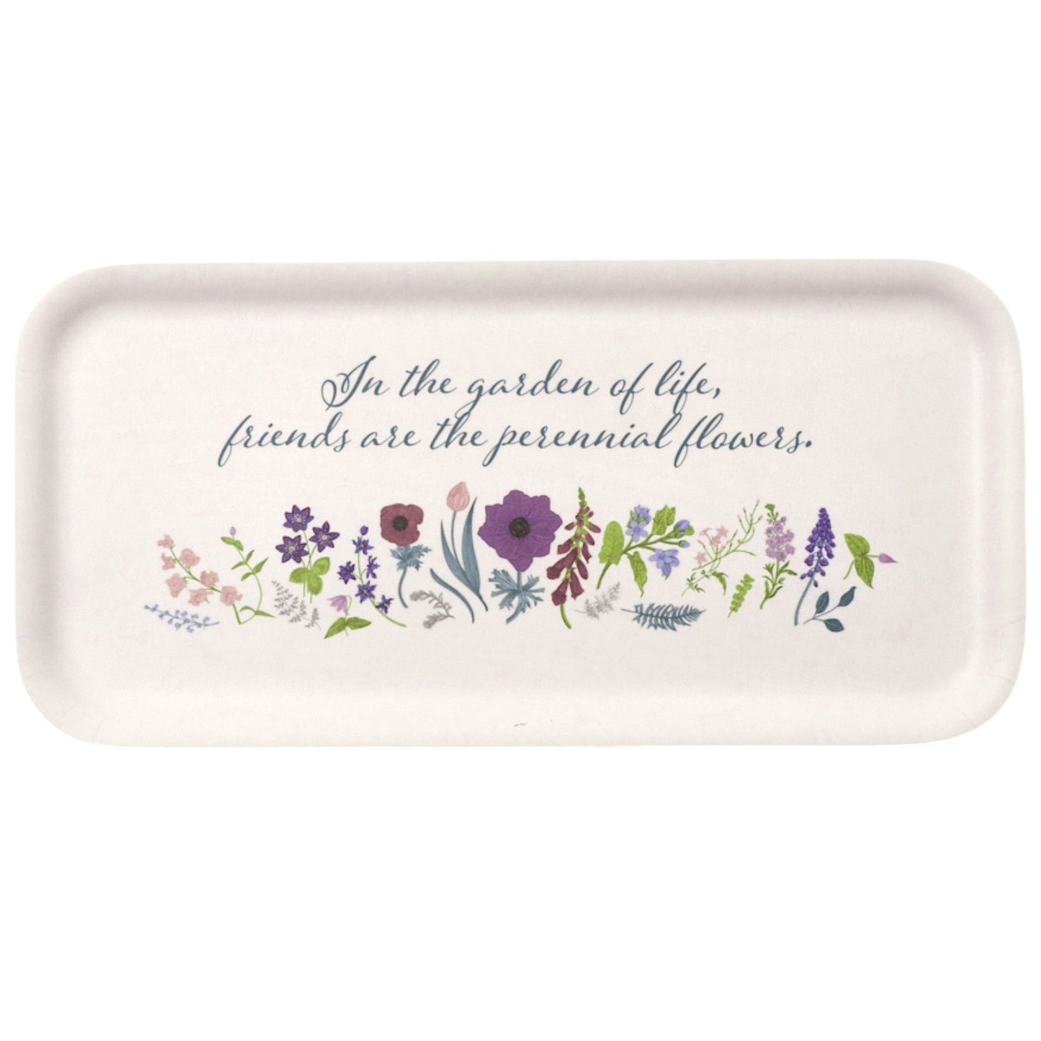 Crafted from fine birchwood, this elegant tray is adorned with the touching words “In the garden of life, friends are the perennial flowers.” A timeless keepsake and a perfect gift. 11" x 5".