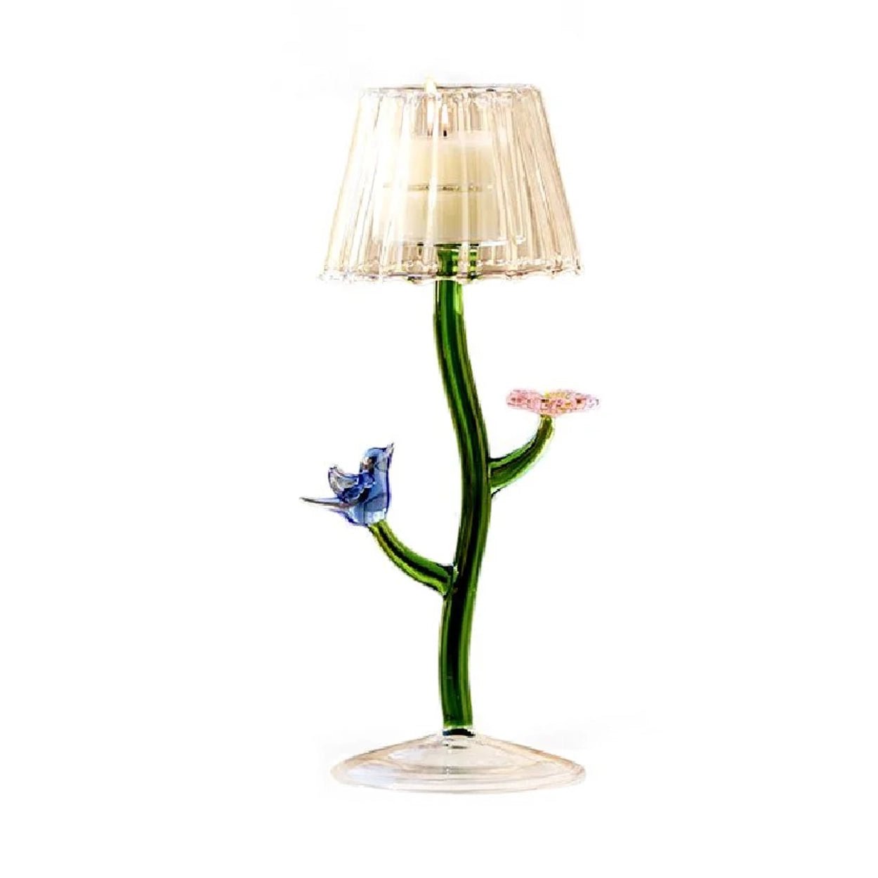 This delicate candle holder is made from mouth-blown glass and features a bluebird and pink flower. Holds a votive or tealight candle. 3 ¼" dia. x 8 3/4"h. (Sold individually.)
