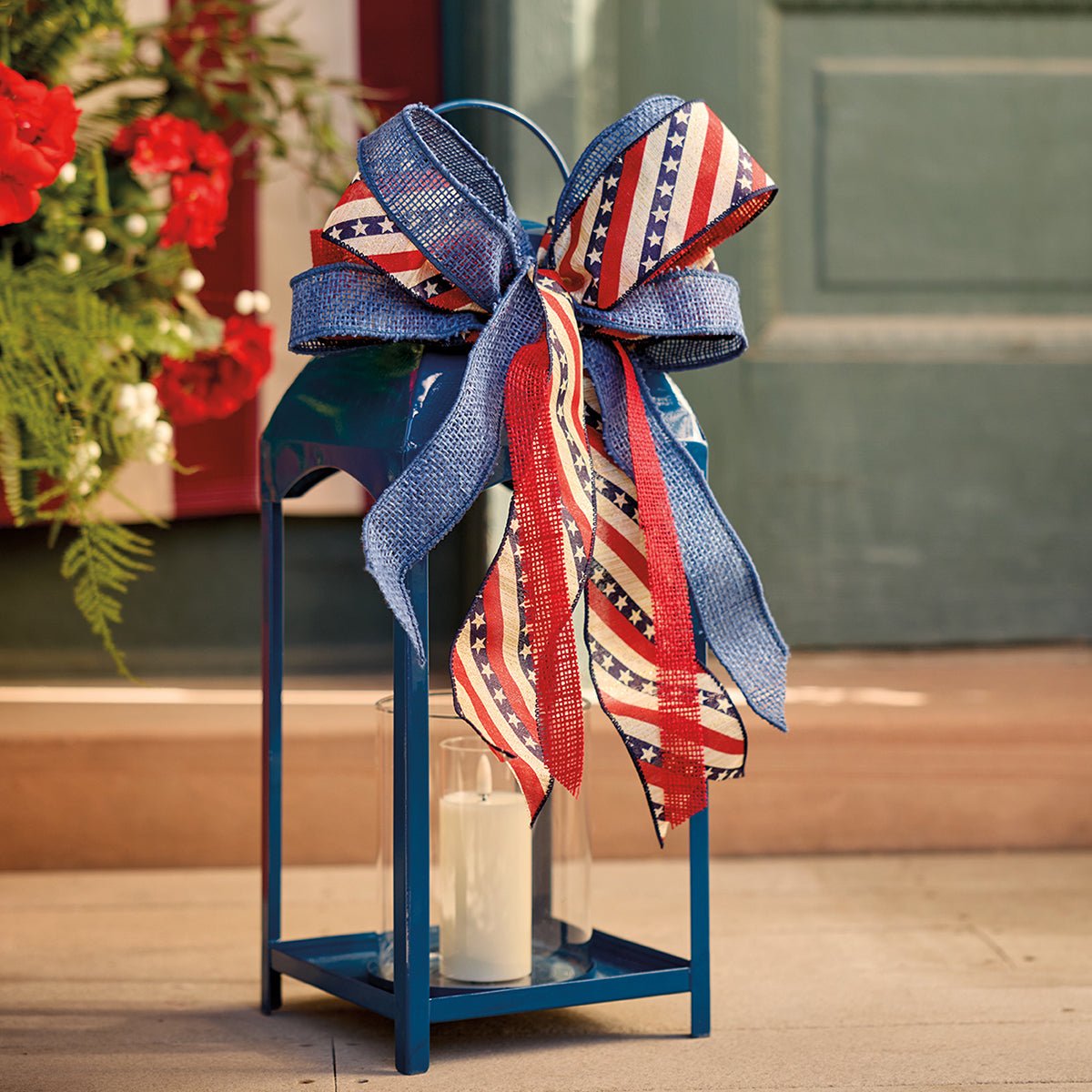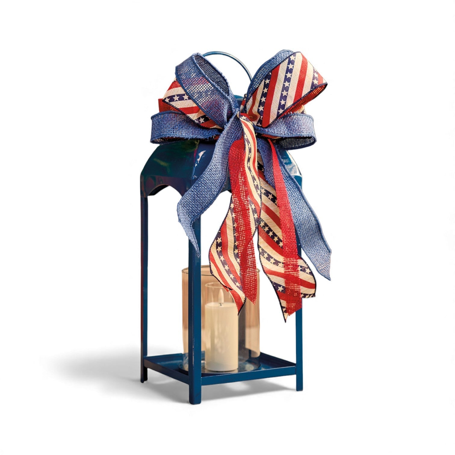 This classic iron lantern adds a timeless touch to any setting, whether placed in an entryway or on a covered outdoor porch. Featuring a removable, hand-tied ribbon with a patriotic flair, it can be styled for seasonal displays or left as a simple, elegant accent year-round. Designed to hold up to a 4" diameter candle. 17 1/2"h x 7 1/4" sq.