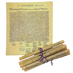 A replica of Thomas Jefferson’s original Declaration of Independence from July 4, 1776. The parchment paper is antiqued to have the same color and appearance as the document currently stored in the National Archives. It arrives rolled and tied with red, white and blue ribbon. 14" x 16".