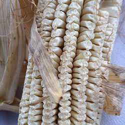Thomas Jefferson grew a dozen varieties of "Indian Corn" in his lifetime, starting in 1774. The "sweet or shriveled" type he planted in 1810 may have been noted in 1705 by Robert Beverly, who described Virginia corn as "a larger grain and looks shriveled with a dent on the back." Virginia White Gourdseed Corn has tapered, flattened white kernels that mimic those of gourds. Young ears are good for roasting and mature kernels make hominy and finely-textured flour.